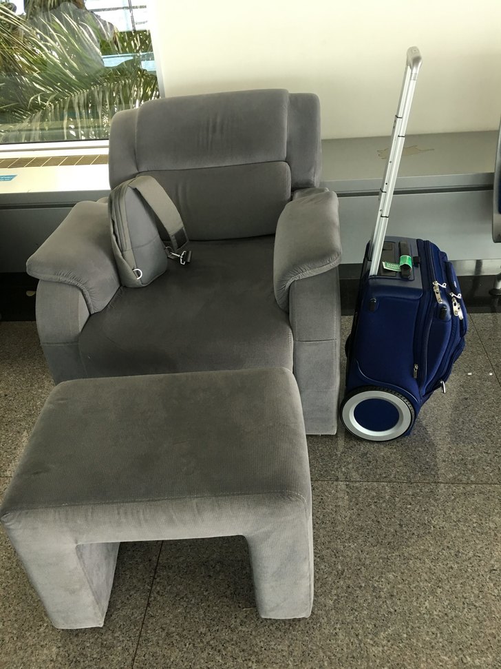 ▼G-RO登機箱在機場的休息區沙發可以躺平