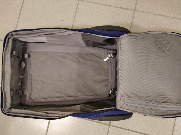 雖然G-Ro有兩個很大很引人注意的大輪子,但因為設計得當,並沒影響內部空間使用。行李箱內部有一片網狀夾層,可以拿來區隔放置物品分類(如衣服放下層,公務用品放上層等);側邊也有一個網狀拉鍊分層(適合拿來放置一些雜物);前方有兩個口袋,可放置需要隨時取放的物品;後方則有一個彈性口袋卡片伸縮套,可放置悠遊卡、公司卡片等通行證;在拉桿後方還有一個分層口袋,可放置水瓶、雨傘等。總而言之,多重的置物空間,可以讓人很方便的分類歸納各種物品,也可以是否需要時常取用而選擇適合的存放空間。