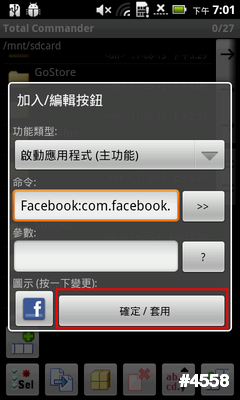 第六個是【顯示/隱藏使用者定義列】,這個使用者定義列可以加入很多自訂的功能,例如變更目錄、內部命令、執行程式等等,這邊示範【加入Facebook App 執行程式】的用法:
