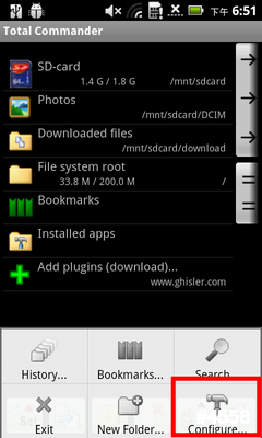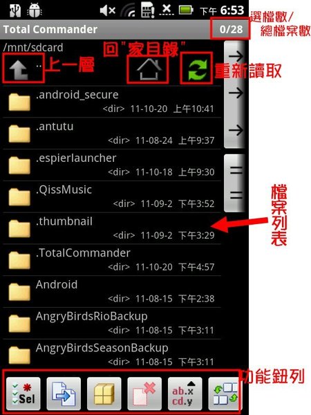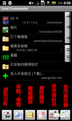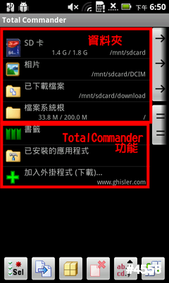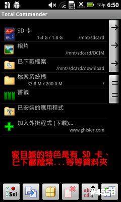 點下圖示啟動 Total Commander,即會看到這個畫面,叫做【家目錄】。裡面除了有 SD 卡的目錄與檔案系統根,也很貼心的為我們加上了相片的目錄、已下載檔案等常用的資料夾。