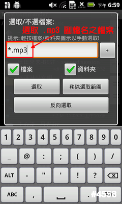 最左邊的按鈕是選取檔案,當檔案很多的時候可以用這個來過濾。例如要選所有的 mp3 檔,就輸入 【*.mp3】,再按【選取】,就會把所有 mp3 檔選起來啦!!