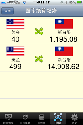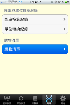 設定的部份,這個版本增加了匯率更新來源選擇與購物清單的幣別設定,匯率更新來源這次新增 Yahoo 的匯率資料來源,你可以根據自己的喜好來選擇更新的來源,如果有更新失敗的情況,除了可以更換更新來源試試看之外,也可測試看看你的設備是否可以連到鉅亨網和香港Yahoo,如果網頁的連結是正常的,基本上更新都會成功,但更新的速度要看你使用的是 3G 網路還是 WIFI 網路,如果狀態還在「更新中....」表示更新還在進行,而不是無法更新,更新失敗或成功,最後都會有訊息顯示,請多留意一下。