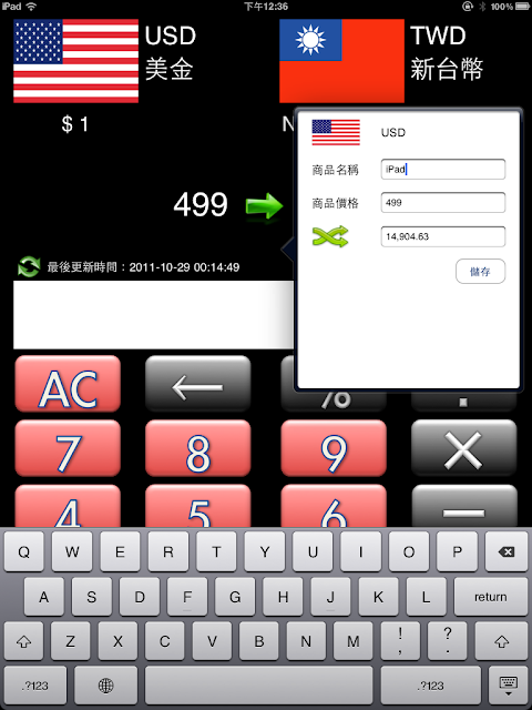 1.5 版首先我們把匯率更新的訊息加到主畫面上,可以在主畫面看到最後更新的時間,也可以在主畫面上直接點選更新按鈕進行更新,這個功能原本在 1.4 版只有 ipad 有這樣的畫面,但考量 iphone , ipod touch 使用者的方便性,我們也調整畫面的規劃,讓更新時間和更新按鈕可以放到主畫面上。
