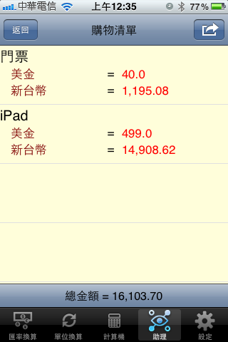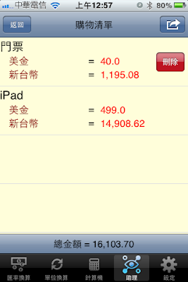 這次 1.5 版更新後,我們加入了一個工程計算機、匯率轉換記錄、單位轉換記錄、購物清單幾項重大的更新。這次加入購物清單是為了讓出國的朋友們有更方便的使用經驗,所以出國除了靠這個軟體幫忙換算金額之外,可以透過計算機答案顯示區的左邊有一個多功能按鈕,點選之後,會出現「加入購物清單」,點選之後,就會進入新增購物清單的畫面,輸入物品名稱,「儲存」後就可以存到購物清單上面。