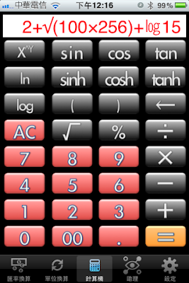 工程計算機的部份,可以計算常用的工程計算,三角函數的部分,這個版本支援的是以角度為單位。