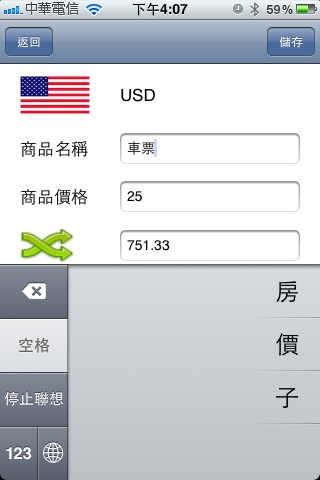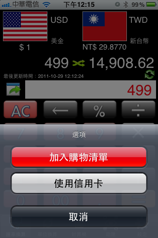 左上的圖可以看到一個是「加入購物清單」的選項,另外一個是「使用信用卡」的選項,因為軟體可以設定信用卡海外刷卡的費用,但出國購物有時候可能使用現金,有時候可能使用信用卡,所以在這個功能能按鈕上,如果是用信用卡付費的話,就可以先按下多功能按鈕,如果上面顯示是「使用信用卡」表示目前的設定是使用現金,所以可以點選「使用信用卡」之後,程式會自動開啟信用卡刷卡手續費的計算,換算的結果會包含刷卡手續費,可以更精準的算出購物清單的金額。如果是要改用現金付費,則可以從設定的地方取消使用信用卡刷卡手續費,或是從多功能按鈕點選後,點選「使用現金」,如果你的設定已經是使用現金,那點選後會出現的是「使用信用卡」而不是「使用現金」,這點要留意一下!