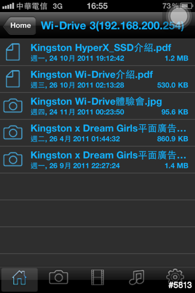 5. 檔案管理:無線硬碟不只分享而已,可以使用雙向的檔案傳輸管理功能,可直接删除、E-MAIL、下載、上傳等基本的檔案管理皆無問題。當然,原來APPLE產品,在影音、文件上都需透過iTUNNE來執行,在WI-DRIVE下,這問題自然也解決了,可直接在此硬碟進行很直覺的檔案移動。