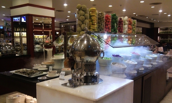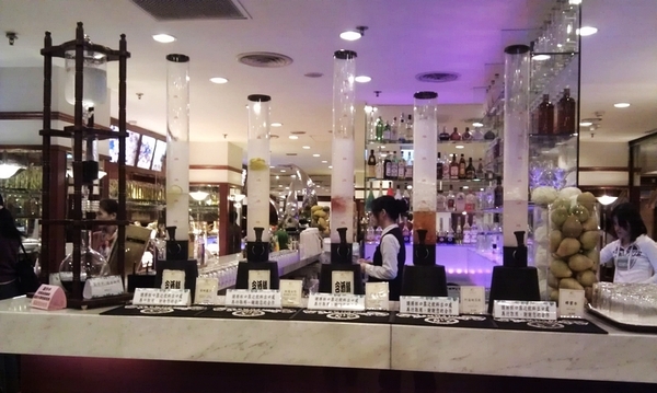 ▲ 蛋糕旁的雞尾酒區,亦有蜂蜜水與阿薩姆紅茶,雞尾酒都非常淡,老嫗可解(是這樣用的嗎!?)。擺放的器具我很喜歡,裡頭冰塊的放置更是一絕。今天不知道為何巧克力噴泉沒有擺出來,敢情送修了?一般都是放在雞尾酒旁邊。