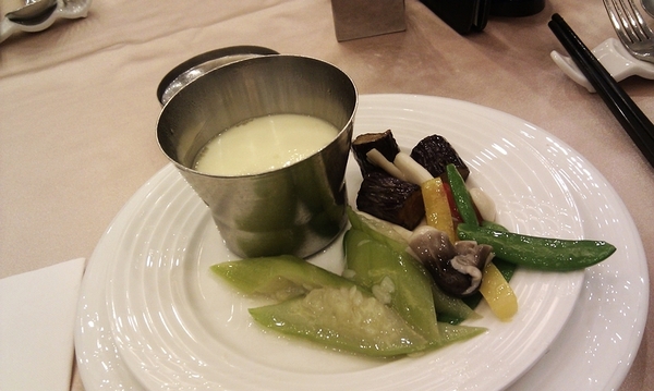 ▲ 第二盤,茶碗蒸裡頭還有香菇、金針等菇類,好吃。甜豆、絲瓜也好吃。作為一個家中賣蔬菜開餐廳的孩子來說,甜豆是令人又愛又恨的蔬菜,如果有浪費甜豆的人一定要好好反省!甜豆是超花時間處理的蔬菜阿!你知道你吃那一口甜豆我們要剝多久嗎!你知道要將兩邊的絲與頭尾去掉要花費多少功夫嗎!我非常熟練一個甜豆也要剝上約0.7秒左右,你想想看吃一口後頭的人要剝多久才有這一口阿!千萬不能浪費食物!(激動!!)