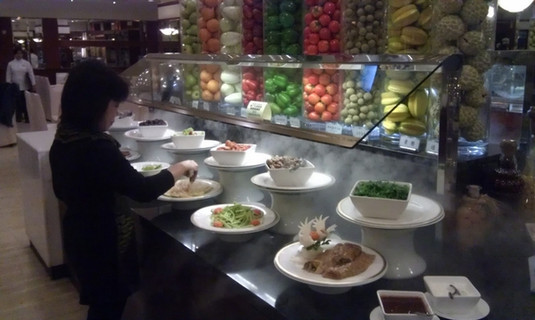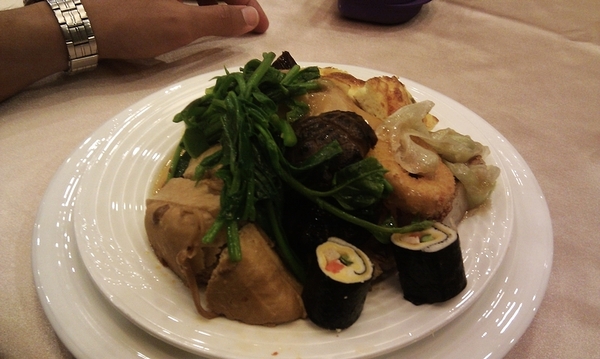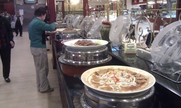 ▲ 中式食物區,拍得有點模糊,右邊還有一大區沒有拍進來,從簡單的炒麵油飯,到費工的小米粥春捲馬蹄條蘿蔔糕香椿豆腐豆漿蕈菇何首烏茶碗蒸什麼都有,春捲很好吃,推薦!