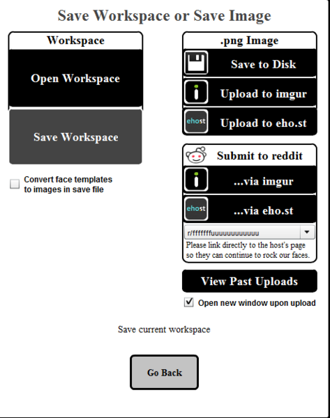 ▲ 直接選存檔或讀取(SAVE/LOAD)會進入存檔畫面,你可以將你的工作環境存起來以便下次繼續(創作系列漫畫?)也可以直接將圖片存回電腦,或是直接上傳到網路上的圖床。