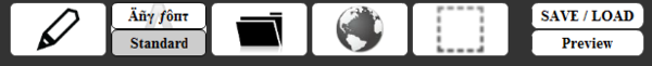 ▲ 最上面的工具列,從左邊依序是「自由繪圖」、「加入文字」(上是所有字型,包括中文,下是標準字型,只能使用英文)、「從自己的電腦插入圖片」、「插入網路上的圖片」、「裁切並創造」。