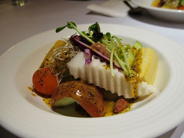 ▲ 我們幾乎點了上面所有的餐(人多嘛),這是套餐所附的沙拉,菜色很多,上頭淋得是百香果醬,山藥蓮霧香蕉堅果等等,非常有誠意,也很好吃。