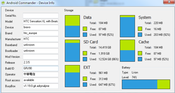 ▲ Device 選項中可以看接上去手機的裝置資訊,從圖中可以看到我這台是 HTC SensationXL。好吧其實他只是台刷 XL Rom 的 hTC HD2 而已,因為有作 SD-EXT,所以可以看到在儲存資訊中有 EXT 的分類,這一個 Rom 總共用了203mb,所以我 Cwm 刷個 220mb 給它比較安全,進入系統後還有 184 mb 可以給我當作程式安裝 Rom 來使用,這顯然是很不夠的,於是我將記憶卡分了一個 Ext4 區出來,切 1G 給 APP 使用。圖中可以看到我已經用掉 647MB 了,還有 313MB 可以安裝,這幾天的Android Market大特價快把我的 ROM 給塞滿了…。
