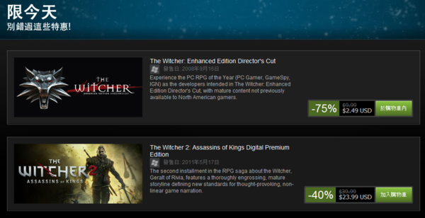 另外我還買了巫師一代導演版,雖然手上還正沉迷在上古捲軸:天際(Skyrim)的世界中(黑暗兄弟會的任務真是讓人完全將身心投入進去阿,連支線任務劇情都如此用心!)但巫師這個在各大網站與玩家口中評價都非常高的遊戲,且賣得如此便宜當然也是得掃一下的,原價 9.99 美金,現在只賣你 2.99 美金!比甚至很多 iPHONE 程式、遊戲都還便宜阿!