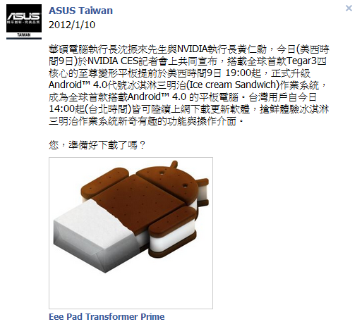 風光上市,爾後馬上因為金屬外殼遮蔽 GPS 訊號事件馬上跌股的華碩至尊變形平板(Transformer Prime),今天其執行長沈振來與 NVIDIA 執行長黃仁勳在 NVIDIA CES記者會上共同宣布,美西時間9日 19:00起,正式升級Android™ 4.0代號冰淇淋三明治(Ice cream Sandwich)作業系統,台灣用戶則是從下午兩點----也就是四個小時以前開始更新,幹得好!華碩!