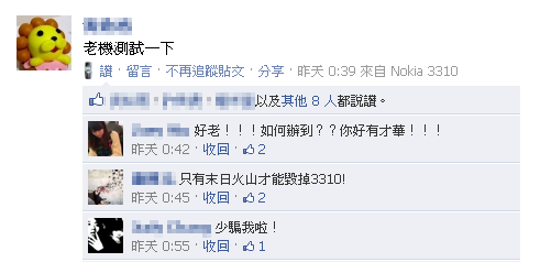 嘿,我正在用 3310 上 Facebook 留言,什麼?你說怎麼可能?就出 app 啦,不過 3310 只能走 GPRS 所以留言比較貴一些,就連下載 app 都比較貴。雖然螢幕小些但兩三行字打打也還是ok…
