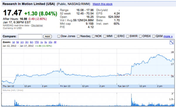 ▲ 三星有意收購的消息一出,Rim 股價大漲8%(來源:mobilesyrup)