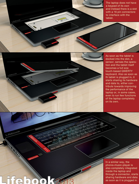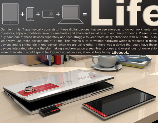 由設計師 Prashant Chandra 所發想的的這款 Lifebook 概念筆記型電,腦整合了包括手機、相機、平板電腦等的科技產品,除了能跟 Lifebook 結合使用外,也能個別分開來使用。在設計上,這款 Lifebook 並沒有配置任何的實體鍵盤,而是利用勘入的平板電腦,充當虛擬鍵盤使用。
