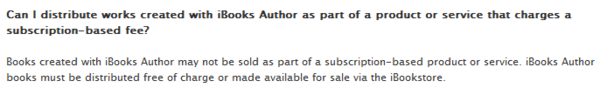 簡單翻譯,如果你將 iBooks Author 所製作出的內容免費散佈的話,那 Apple 將不會干涉你任何使用的方法,反之,如果你想要用 iBooks Author 所製作出的內容賣錢的話(使用任何方法),那你只能通過 Apple 來銷售,並在銷售時會為該內容定下一個書面的協議。且 Apple 有權力來審核是否通過。
