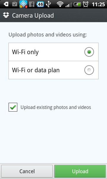 ▲Dropbox for Android 2.0.9 多了新的 Camera Upload 功能,可以幫使用者一次將手機的照片都自動同步到 Dropbox 裡。