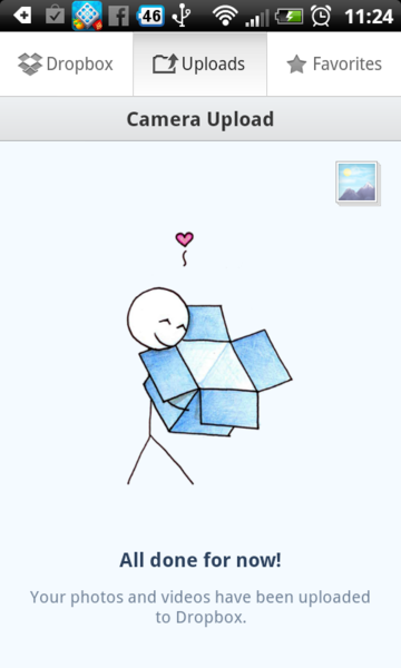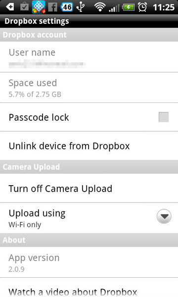 Dropbox for Android 2.0.9 新增 Camera Upload 功能會自動匯入使用者手機的照片及影片至 Dropbox 之中,用戶不用再一張一張上傳到 Dropbox 空間。且除了原本的免費 2GB 空間外,使用者在下載新測試版本後利用 Camera Upload 功能上傳首張照片到 Dropbox 之後,就會自動獲得額外 500MB 的儲存空間。之後每透過自動的 Camera Upload 上載 500MB 圖片或影片,就會對應獲得額外 500MB 空間,最高贈送的免費空間上限為 5GB。