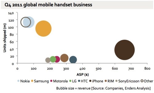 從圖表中我們可以看到,有一個廠商遙遙領先著其他廠商,在單機平均定價與銷售數量的數字都排名非常的前面——特別是單機價位上頭,有一點太驚人了。是的,Apple 因為只有生產智慧型手機 iPHONE,且價位一直以來都在兩萬台幣以上,其熱賣的同時單機價位也能保持不墜。而反觀銷售量前二名的 Nokia 與 Samsung,Nokia 幾乎是排到了最後一位,而 Samsung 也沒有好到哪裡去,第五名的中興更是被歸類到「Other」去了。而在 Apple 之後單機定價次高、次次高的分別為 hTC 與 RIM(黑莓)。這兩家廠商與 Apple 相同,僅生產智慧型手機而能拉高單機售價,但銷售量就比不上 Apple 那驚天地泣鬼神的數字了(數字見上圖表)。而在更後面,功能手機與智慧型手機都有生產的 LG、Moto、Sony等單機售價就排到很後面,一直到以功能手機為大宗的 Samsung、Nokia。更詳細的報告將會在下個禮拜在endersanalysis網站刊出,目前我們可以知道,智慧型手機的單機售價仍是遠遠高出一般功能手機一大截。