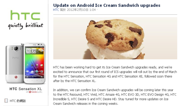 hTC 在這篇訊息中說到,三月將會為 HTC Sensation 系列(原版SS、XE、XL)提供 Android 4.0 更新,XL 將會在 Sensation、XE 之後提供。而在三月之後也將會陸續提供其他機種的 Android 4.0 更新服務,目前確認的機種有(以下為客製機種)HTC Rezound, HTC Vivid, HTC Amaze 4G, HTC EVO Design 4G,(以下為國際版機種:就是台灣也有賣的)HTC EVO 3D, HTC Incredible S, HTC Desire S and HTC Desire HD。雖然沒有確切的時間表,但會提供 Android 4.0 更新看來已經是確定的了,只是什麼時候放出就是另外一個問題。