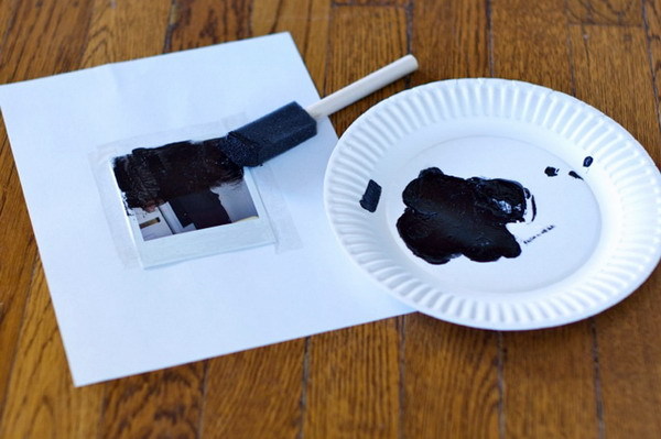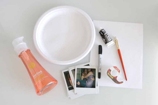 需要準備的材料︰拍立得相機、黑色塑膠彩(Acrylic paint)、碗碟清潔劑、透明膠紙、紙碟、白紙、黑色馬克筆。