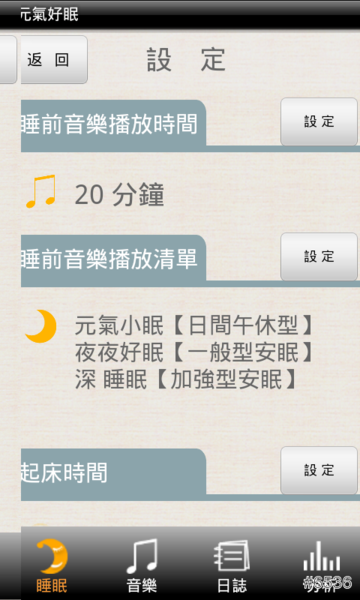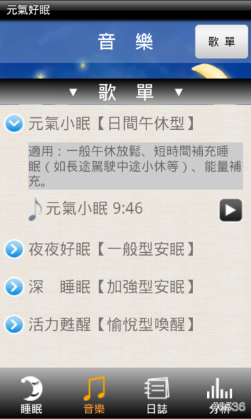 ▲《元氣好眠》App 裡擁有許多適合不同睡眠狀況的搭配歌曲,可使讓使用者依目前的睡眠狀狀來選擇。像「元氣小眠」、「夜夜好眠」、「深 睡眠」都是以舒眠為主的功用,而且每首歌曲的長度都不相同,屬於輕音樂類型,相當適合睡眠前幫助放鬆心情聆聽。