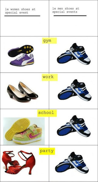 雖然說男生跟女生在生活中,本來就有許多差別,不過如果用漫畫來表達可就有趣了! 打電動 喜歡打電動的男生會讓人覺得很宅,不過喜歡打電動的女生可能大家還蠻想娶的 上廁所 比起男生上廁所,女生廁所應該很常大排長龍 剪頭髮 女生常花大錢卻沒啥改變,但男生一點小錢就像換了一個人 房間跟車子的整齊度 如果有人要來找你/妳時 女生是忙著化妝,男生則是忙著打掃 男生跟女生分手後的狀況 男女生打電話 男生講話就是很機車XD 男女生吵架的狀況 女生跟男生各場合所穿的鞋子 3 個人說讚 收藏 快速回應 引言回應