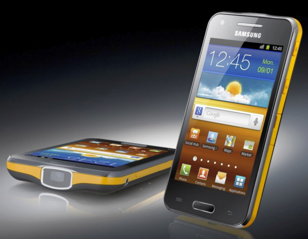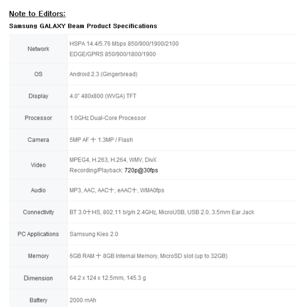 Galaxy Beam 就是一隻以能夠發出射線--好吧,是微投影--的 Android 手機,搭配了 800x480 的 TFT 螢幕,1 GHz 雙核心處理器,Android 2.3系統(Android 2.3?在2012年?),500萬畫素鏡頭,130萬畫素前鏡頭,LED 補光燈,最高可以錄 720P 影片,而最重要的投影功能,三星說將會高達 15 流明(在微投影界中算很不錯)。至於三星規格表中的 6GB Ram 應該是筆誤…。