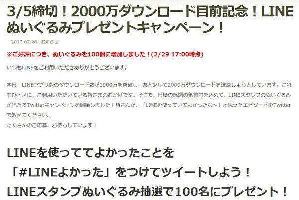 參加方法:首先要 follow LINE 的官方 twitter:www.twitter.com/NAVER_LINE,然後在前面發表使用心得推,記得要加上「#LINEよかった」tag,而且這個 tag 的前後都要注意要有一個半型空白跟其他內容分隔開,這樣就可以了。獲獎的人 LINE 官方會用 twitter DM 通知。