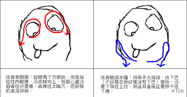 2.改善黑眼圈跟眼袋:用食指從兩眼眼角下方往內輕推,沿鼻樑、眉心、眉骨往外畫圈,再推往太陽穴,把瘀積的血液排掉。