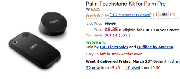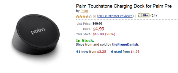 而在乳摸當中,這一段讓我感到有些興趣「…不過為了避免增加手機售價,未來可能採用選配的方式讓消費者選購。…」,唔,那究竟無線充電套件的價格大概會是多少呢?首先我就想到了,如果去查 PalmPre 的無線充電組合的售價,或許可以拿來借鏡一番。