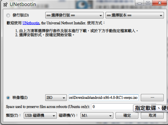 ▲ 我們選擇下面的 iso 檔,點右邊的「…」來選擇你剛剛抓下來的 Android 4.0 iso 檔,然後插上你的隨身碟,磁碟機選正確後按下確定。