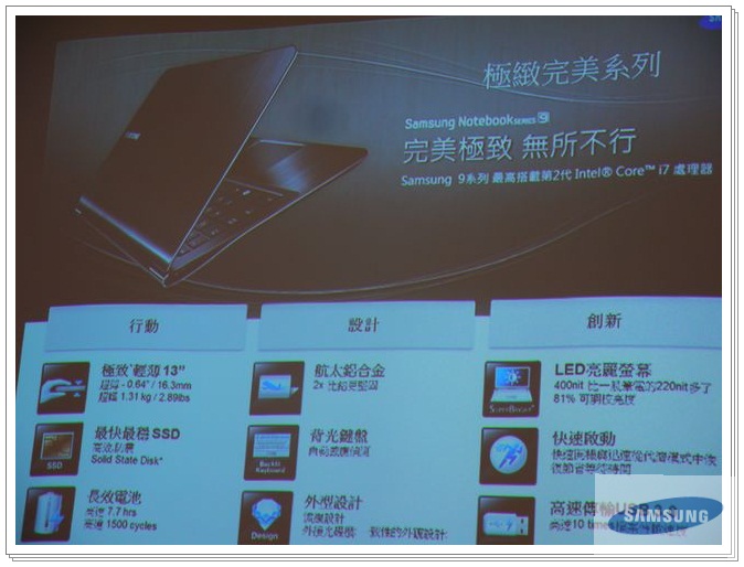 9系列特色就是輕薄、內建SSD、可達7.7小時的長效電池、航太鋁合金、背光鍵盤、流線設計的外型、亮度400nit 就是比別人高的LED螢幕、快速開機及USB3.0快速傳輸。