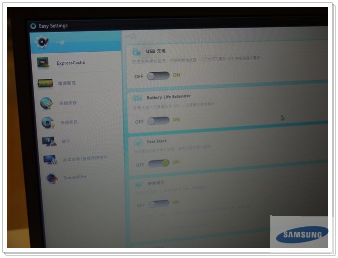 SMSUNG內建East Setting,可以集中設定Express Cache電源管理、有線網路、無線網路、顯示、電源模式及音效設定等,鍵盤的背光亮度也可以在這邊做調整。