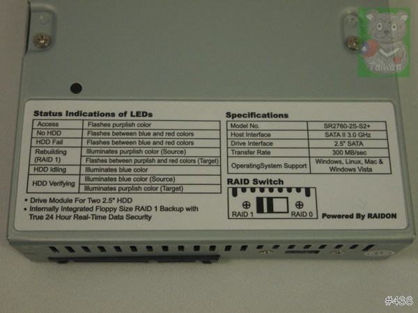 外觀簡單樸實、主要的也是唯一的切換開關及說明在機體上就可以看見了,所以不用擔心找不到手冊、更不用擔心複雜的設定,撥過來撥過就、設定RAID 0 / RAID 1這樣的磁碟陣列就是這麼簡單,而且只佔你主機板上一個SATA接頭!還有不用擔心你的主機板不支援RAID磁碟陣列功能、SR2760-2S-S2+裝上去就搞定了!