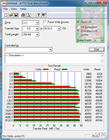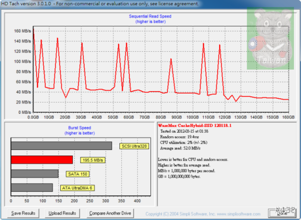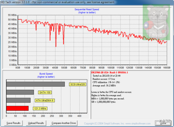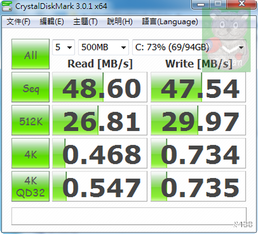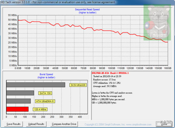 可以看到並沒有由Toshiba 2.5” SATA 640G HD的66掉下來一半...只掉到48.6而已,傳說做RAID 1效能馬上掉一半、看來是不完全正確的,何況Toshiba 640G是新的2011年製程,馬克這兩顆160G HD都是好多多年前的老骨頭了!