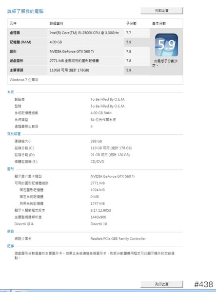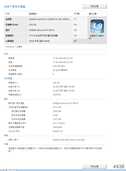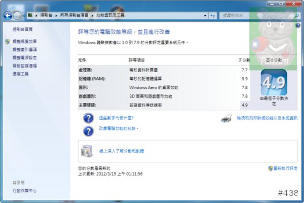 由Windows7 體驗指數可以看到全部都沒有改變、只有硬碟體驗指數…掉到4.9,不過別忘咯!指數掉一可是資料安全加倍喔。