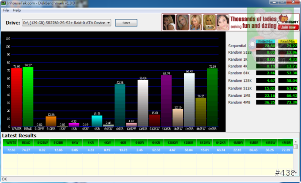 SSD單碟效能、前一篇分享做過了,單顆HD TOSHIBA SATA-2 2.5”640G測速、也做過了,所以接著要做的測試有SR2760-2S-S2+ RAID 0實測、Cachehybrid + SR2760-2S-S2+ raid 0實測、SR2760-2S-S2+ Raid 1效能實測、Cachehybrid + SR2760-2S-S2+ raid 1效能實測,為大家求取效能與安全及經濟的最大效益。