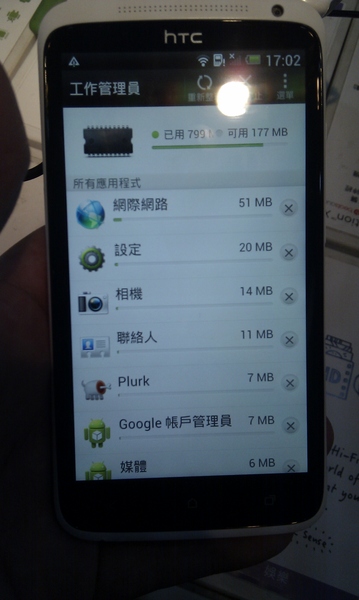 ▲ hTC Sense 的好用是有口皆碑的,但其吃記憶體的程度也是有口…皆碑,即使到 OneX 規格給到 1GB ram,但在展示機被狂操的情況下,閒置記憶體仍然是只有有些危險的 177mb。