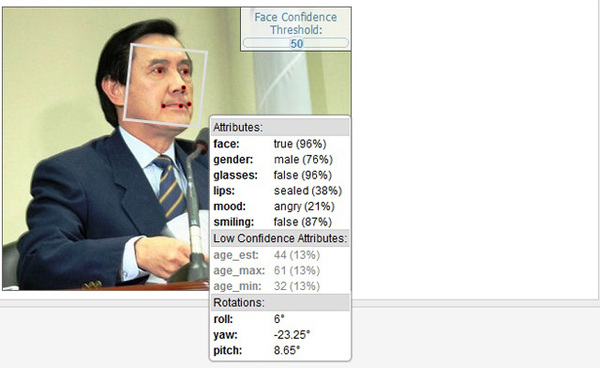 隨著科技的發達,也漸漸推出許多能偵測人臉的工具,來辨別每個人的表情所代表的意義。 Face.com網站就推出人臉辨識服務,只要上傳你的照片就能幫你辨識你的年齡跟你的心情。 ▲Face.com 推出用照片辨識年齡服務,還能偵測你的心情。雖然網站介面很陽春,不過操作起來卻很簡單。 ▲先在左側找到 upload 按鈕將照片上傳。 ▲上傳後再按下 Call Method 就可以。 ▲右側就會顯示出你剛剛上傳的照片的年齡跟心情。 ▲拿名人來測試一下。嗯~~~~準確度待懷疑XD 資料來源 1 個人說讚 收藏 快速回應 引言回應
