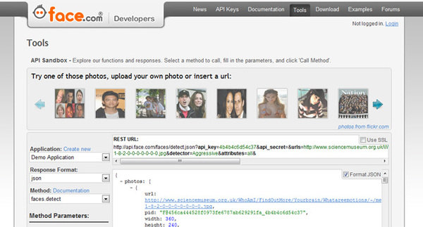 Face.com 用照片測試你的年齡跟心情 科技 · 小ㄤ · 發表於 2012-04-02 11:24 · · 檢舉 列印版 twitter plurk 8.4千閱讀次數 隨著科技的發達,也漸漸推出許多能偵測人臉的工具,來辨別每個人的表情所代表的意義。 Face.com網站就推出人臉辨識服務,只要上傳你的照片就能幫你辨識你的年齡跟你的心情。 ▲Face.com 推出用照片辨識年齡服務,還能偵測你的心情。雖然網站介面很陽春,不過操作起來卻很簡單。 ▲先在左側找到 upload 按鈕將照片上傳。 ▲上傳後再按下 Call Method 就可以。 ▲右側就會顯示出你剛剛上傳的照片的年齡跟心情。 ▲拿名人來測試一下。嗯~~~~準確度待懷疑XD 資料來源 1 個人說讚 收藏 快速回應 引言回應 登入來回應 header home