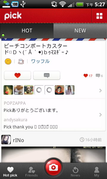 ▲PICK 的介面相當簡單,HOT 指的是熱門的照片而 NEW 則是新發表的照片。下面的選單則可以查看熱門的圖片、朋友的訊息、別人的回應、自己所拍的照片等。