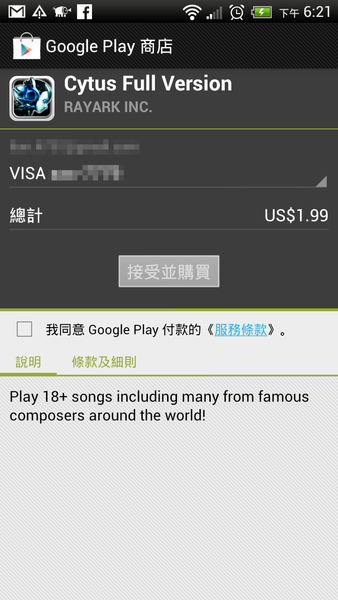 ▲ 直接點擊付費就會跳到 Google PLAY 的 in-app 購買頁面,這邊台灣不受限制,一樣可以付費購買,我在台灣用台灣的信用卡,購買完成。
