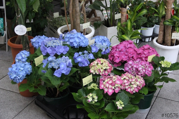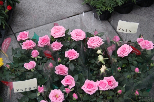 高知商店街的一隅,紫陽花(繡球花)粉紅色和紫藍色都很嬌豔地綻放,粉紅玫瑰花,也柔媚地盛開,不知哪位過客,會把花兒買回去,帶走一抹春的氣息。