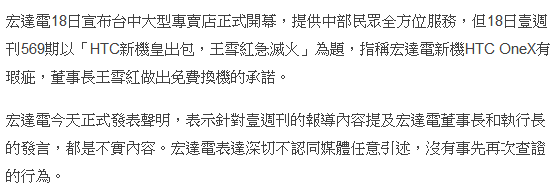 ▲ hTC 聲明壹週刊所報導關於 hTC OneX 可免費更換皆為不實訊息。(來源:聯合新聞網)