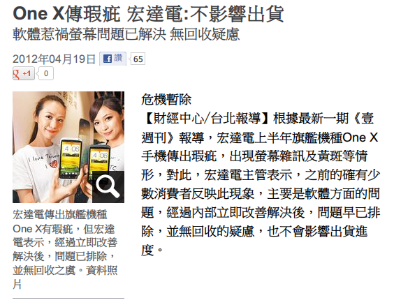是的,壹週刊在前幾天不知怎麼搞的佛心來著,大幅報導了 hTC OneX 的瑕疵問題,以及 hTC 老闆王雪紅發豪語,要讓有問題的 OneX 都能免費換新。嘩,此報導一面世,群眾為之驚嘆,紛紛奔走告知,皆言 hTC 有 Guts,這女人當家卻能如此豪邁,做生意如此不愧為王氏之女。嘛,正當眾人群情激憤,就連分析師名嘴也寫好隔天上電視的標題:「巾幗不讓鬚眉,2498當起」,好了,一桶冰水澆下來:「呃,歹勢,是不是哪裡弄錯了,我們沒有這樣說喔。」………╯-__-)╯ ╩╩